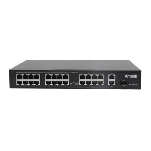 - AMATEK, AN-S26P24; Коммутатор на 27 портов (24 PoE порта + 2 порта Uplink + 1 порт Uplink SFP): 24 п